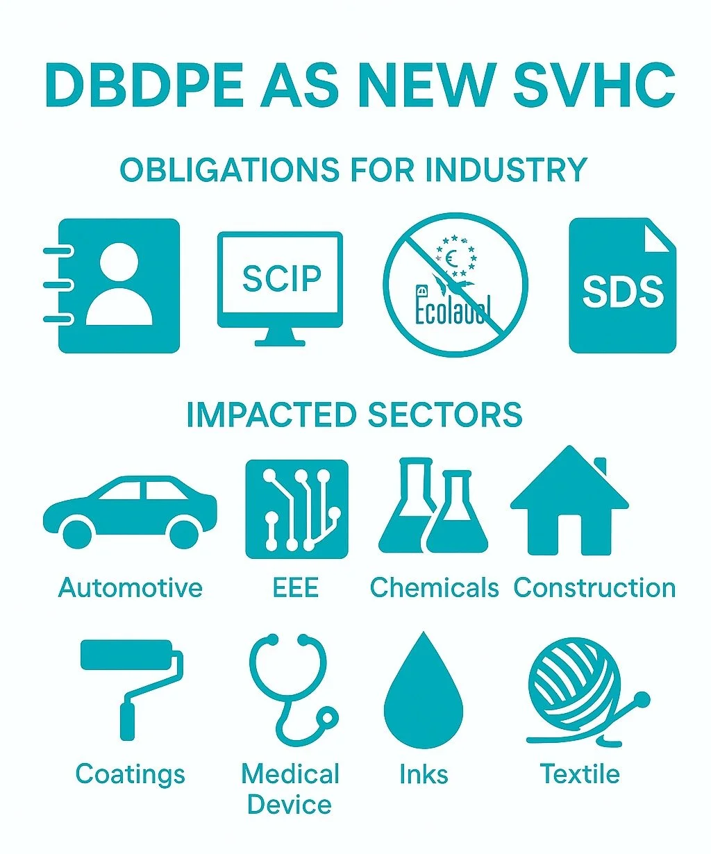 ECHA adds DBDPE (CAS 84852-53-9) to the REACH Candidate List, expanding SVHCs to 251. Companies face new EU disclosure, ECHA & SCIP notification, and labeling duties under REACH and the Waste Framework Directive. Affective sectors include automotive, electrical & electronics, chemical and consumer products, medical device, textile, and toys.